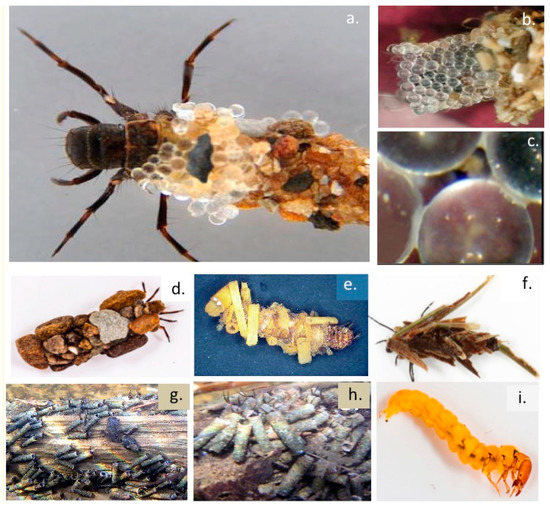 The marine Sandcastle worm (Phragmatopoma californica) (Figure 1d–f) and freshwater Caddis-fly (order Trichoptera) larvae (Figure 2) precisely assemble protective encasing tube-like structures using an adhesive to cement particles of sand, crushed crustacean shell, vegetation or small stones into a protective encasing structure (Figure 2d–f). This adhesion process has been examined in-vitro using small glass beads illustrating the high precision and structural features of this tube assembly process (Figure 2a–c). Furthermore, such Sandcastle worm formations also produce higher order tube-networks in marine environments which stabilize sand reef formations preserving the integrity of the shoreline from erosion. The Caddis-fly tube attaches a similar tube-like structure to the underside of submerged large stones where the Caddis-fly larvae are protected from predators and they undergo metamorphosis to the nymph stage prior to their emergence from these tube-like structures as mature insects (Figure 2g,h).