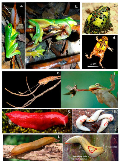 Some surprising terrestrial organisms (snail, slug) utilize innovative adhesives to provide firm but selective bimodal attachment to surfaces to not only facilitate sliding movement over surfaces, but these exudates under certain circumstances can also become highly adhesive providing firm anchorage to surfaces that provides protection from their removal by predators. Green tree frogs inadvertently encountering such exudate deposits from red triangle slugs on tree branches remain immobilised for several days (Figure 3a,b). Some of these exudates have even been shown to have anti-bacterial properties. A particularly unusual aspect of the dorsal skin exudate of the crucifix toad Notaden benetti is its semi-permanent adhesive properties which ensures prolonged sexual union occurs over many hours ensuring mating has a successful outcome (Figure 3c,d). In some reptiles (gecko, salamander) and amphibians (frog) the adhesive properties of mucous secretions on their tongues are differentially regulated to improve capture of food species by the tongue but become non-adhesive when the captured item is recovered into the mouth (Figure 3e,f). The mucilaginous exudate of slugs has impressive adhesive properties in some contexts and has been developed into a medical adhesive (Figure 3g–j). This is discussed further later in this review.
