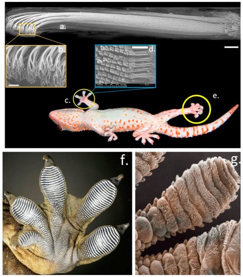 The structural organisation of the Gecko foot parts which facilitate remarkable dry adhesion properties on vertical surfaces. Bundles of fine hair-like setae aligned in the toes of the foot parts visualised by electron microscopy, notice the terminal specialisation in these structures which is critical to the adhesive process (a–e). Higher power images of the foot parts showing the aligned rows of setae (f,g). Images reproduced from [30] with permission.