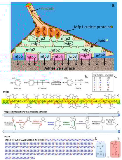 Schematic depiction of the mussel byssus adhesive proteins (Mfp’s) showing the hierarchical organisation of Mfp-2-6 in the attachment zone and the cuticle forming Mfp-1 (a). Pre-col proteins in the byssal thread have visco-elastic properties of importance to the dynamic dissipation of forces through this structure. The catechol moiety of L-DOPA has important roles in byssal adhesion and is produced by the the action of tyrosine hydroxylase on L-tyrosine in specific compartments of the mussel during fixation (b). The Mfp’s have variable contents of L-DOPA (c). Mfp-5 with a high L-DOPA content (d) has particularly important contributions to make to byssal adhesion by a number of mechanisms based on the catechol functionality of L-DOPA (e). Barnacles also utilise L-DOPA to facilitate adhesion to substrates however is distinguished from the mussel attachment process through interactions mediated by phosphoserine which is a more predominant barnacle amino acid and has roles in the formation of permanent concrete-like attachment to sub-strata (f,g).