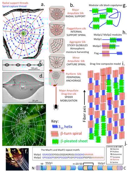 Composite schematics figure depicting the complexity of spider silk assembly into web structures with inserted images depicting the sticky globules of the capture spiral and how moisture is harvested from the atmosphere as water droplets distributed in these globules in the web and secretion of silk fibres from a spider spinerette gland. The radial support fibres distributed like spokes in a wheel and the radial capture spiral and its globular deposits are major features of web assembly (a). Different silk fibre types assembled into specific structural features identified in the web, including ampullate silk fibres in the radial support fibres, flaggeliform silk fibres in the internal support spiral, aggregate silk of the sticky globules of the support spiral, minor ampullate silk of the capture spiral, pyriform silk deposits as peripheral anchorage regions of the web and major ampullate drag-line silk that the spider uses to move around the web complex (b). Sticky globules assembled in the capture spiral showing internal central glycoprotein (gc) depositions (c,d) responsible for retrieval of atmospheric moisture (e) and capture of prey species. High power image showing silk fibre ejection from a spinerette which are spun into fibres of variable composition (f). Major structural features of functional modules in the composite silk fibre showing its modular block copolymer construction (g) and the β-pleated sheet modules (h) which assemble as micro-crystalline regions, and 310 helices, and β-turn spirals in the MaSP1/MaSP2 spidroin components of the composite silk fibre (i). Crystalline β-pleated sheet regions are considered to convey strength to the fibre and the 310 helices, and β-turn spirals convey elasticity and ductility to the silk fibre. Modular amino acid repeat sequences in silk fibre spidroin protein (MaSP1/MaSP2) components of the composite silk fibre showing their block amino acid repeat polyalanine modules and GGAGQGG modular repeats of Spidroin1 (MaSP1) and GPGQQGP modules of Spidroin2 (MaSP2) (j).