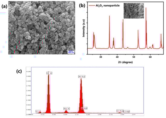 (a) SEM image of Al2O3 nanoparticles. (b) XRD pattern of Al2O3 nanoparticles. (c) EDS spectrum of the nanoparticles.