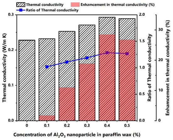 Stability issues of the nanoparticle in phase change material is another critical parameter in assessing the properties. In particular, zeta potential and thermal conductivity enhancement ratio are the critical parameters to be analyzed. The stability of the nano-dispersed paraffin wax at different compositions was analyzed using a zeta potential analyzer (Malvern Zetasizer, Malvern Panalytical, Malvern, U.K.). The zeta potential results of the as-prepared samples are tabulated in Table 3. Based on the results, it was found that the paraffin wax with 0.4% Al2O3 nanoparticles is more stable compared to the other samples. The paraffin wax with 0.4% Al2O3 nanoparticles showed excellent stability, whereas the particles with 0.3% and 0.5% Al2O3 nanoparticles showed good stability. Similarly, the nanoparticle concentrations of 0.1% and 0.2% showed incipient instability. A physical examination of the prepared samples revealed a small agglomeration of the nanoparticles at the bottom using 0.3% and 0.5% Al2O3 nanoparticles along with paraffin wax. The thermal conductivity levels of pure paraffin wax and paraffin wax with different compositions of Al2O3 nanoparticles compared with that of pure paraffin wax were measured using the TEMPOS thermal analyzer. The results of the thermal conductivity of paraffin wax and paraffin wax with 0.1%, 0.3%, 0.4%, and 0.5% Al2O3 nanoparticles are plotted in Figure 3, along with the thermal conductivity enhancement ratio. It can be seen that there is a significant enhancement in the thermal conductivity of paraffin wax with 0.4% Al2O3 nanoparticles. However, the thermal conductivity of the paraffin wax using 0.5% Al2O3 nanoparticles decreased.