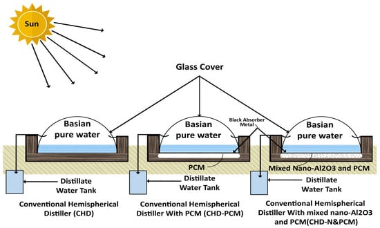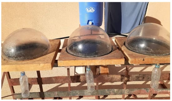 The experimental test rig consists of three identically shaped hemispherical solar distillers. The distillers are made of circular-shaped steel plates with a diameter of 38 cm and a depth of 4 cm. The still basins are painted black to increase solar absorption, and the glass cover has a diameter of 40 cm and a thickness of 3 mm. The still basin is secured in a wooden box 25 cm thick filled with thermal insulation to insulate the inner sides. The first distiller is a CHD with a 1 cm high level in the distilled basin. The second distiller is filled with 1 cm thick paraffin wax (PCM) with a total mass of 0.75 kg, and it is also utilized in the bottom of the distiller and protected by a galvanized steel plate. The third distiller is filled with the same PCM with Al2O3 nanoparticles with a mass of 3 g. The condensed water flows down from the sides of the glassy cover and is collected through the collection channels. The employed distillation apparatus is depicted in Figure 4.