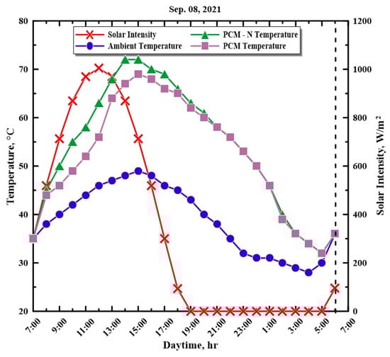 In this experiment, three hemispherical distillers were developed and operated, which took place on 8 September 2021 in southeastern Algeria (6°47′ E and 33°30′ N). The data were collected for twenty-four hours, from 7:00 a.m. to 6:00 a.m. the next day. The performance of solar distillers is greatly influenced by sun intensity and ambient temperature. Thus, it was necessary to measure and record the required data every hour throughout the experimental day. Figure 6 depicts the hourly variation in the solar intensity, ambient temperatures, PCM, and PCM-N temperatures during the trial hours. The solar intensity increased until it reached its peak of 1004 W/m2 at 12:00 p.m. Then, as time passed, after reaching the maximum solar intensity, it gradually decreased until it approached zero after sunset. At the same time, the ambient air temperature varied between 28 °C and the highest recorded ambient temperature of 49 °C at 3:00 p.m. We also found that the PCM temperature ranged between 32 and 69 °C, and the PCM-N temperature ranged between 32 and 72 °C, which might be due to the enhancement in the thermal conductivity by the addition of nanoparticles, which leads to heat diffusion through the PCM.