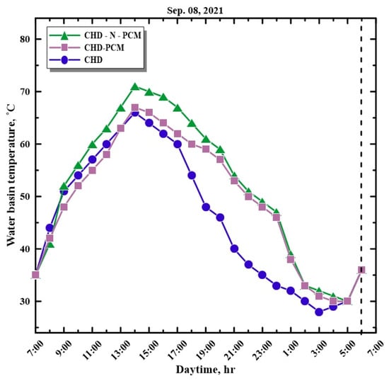 Figure 7 shows the variations in the temperature of water recorded from the SS using different configurations from 7:00 a.m. to 6:00 a.m. on 8 September 2021. From the experimental results, the HSS using PCM with Al2O3 nanoparticles was higher than the HSS with PCM as energy storage and the HSS without PCM during the peak solar radiation condition. This may be due to the enhanced thermal conductivity of paraffin wax with metal oxide nanoparticles. Additionally, it was observed that the water temperature of the HSS without paraffin wax in the basin was higher during the sunshine hours, as the paraffin wax absorbs the heat from the water, which simultaneously reduces the temperature. The melting temperature of wax improves the storage of energy, which is used during the night hours for enhanced water temperature for a higher rate of evaporation. The peak water temperature recorded at 14:00 h (2:00 p.m.) from the HSS using PCM with the Al2O3 nanoadditive was 71 °C, whereas the peak water temperatures of the HSS with paraffin wax as energy storage and without energy storage were 67 and 66 °C, respectively.