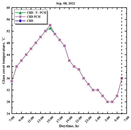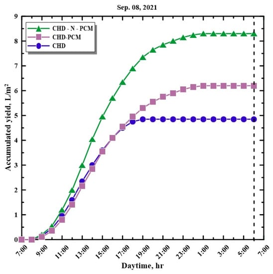 Figure 8 shows the variations in the temperature of the acrylic cover on the external surface and recorded from the SS using different configurations from 7:00 a.m. to 6:00 a.m. on 8 September 2021. The external cover temperature variations show that the temperatures of the covers from HSS using nano-enhanced paraffin wax, HSS with paraffin wax, and HSS without energy storage were almost identical. It is observed that the temperature of the hemispherical cover surface reached a maximum of 54 °C for HSS with paraffin wax in the basin and conventional HSS, whereas the cover temperature of HSS with nano-enhanced paraffin wax was 53 °C. According to the obtained results for the temperatures of both the glass cover and the PCM with and without nanoparticles, the maximum temperature difference was found with CHD-N-PCM, which is the main driving force for evaporation and condensation (double-diffusive). Consequently, the addition of nanoparticles enhances productivity. Figure 9 shows the variations in the accumulated yield from the SS with a hemispherical cover and using various configurations from 7:00 a.m. to 6:00 a.m. on 8 September 2021. It is observed that the cumulative yield of potable water produced from the hemispherical solar still using nano-enhanced paraffin wax is higher than the HSS with paraffin wax and the HSS without any energy storage medium. The daily accumulated yields for CHD, CHD-PCM, and CHD-N-PCM are 4.85, 6.2, and 8.2 L/m2, respectively. Table 5 shows that the daily yield productions from CHD, CHD-PCM, and CHD-N-PCM are 4.85, 6.20, and 8.30 L/m2/day, respectively, achieving improvement percentages of 27.84% and 71.13% compared to the conventional hemispherical distiller.