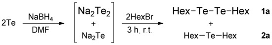 Although the crude product 1a was obtained in reasonable yields in most of the reactions, the ratios of ditelluride 1a to telluride 2a were fluctuated depending on the reaction conditions (Table 1), which is consistent with our previous observations [15,25]. When NaBH4 was used in the range of 0.8–1.5 eq, the yields increased with the increasing amount of NaBH4, but the ratios of 1a to 2a decreased. The reaction temperature also influenced the results. However, when the reactions were conducted at 60–100 °C, the ratios of 1a to 2a tended to fluctuate at given amounts of NaBH4 and reaction times. Based on these results, we believed that the ditelluride dianion (Te22−) could be further reduced to the telluride dianion (Te2−) that led to the formation of corresponding dihexyl telluride (2a). The reactions were also carried out in the range of time 0.5–2 h, and the ratios of 1a to 2a diminished over the elongated reaction time. This might imply that the formed ditelluride dianion could equilibrate with telluride dianion.