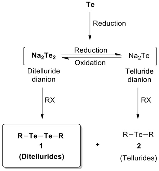 - Engman, L.; Cava, M.P. Organotellurium Compounds 5. A Convenient Synthesis of some Aliphatic Ditellurides. Synth. Commun. 1982, 12, 163–165. [Google Scholar] [CrossRef]