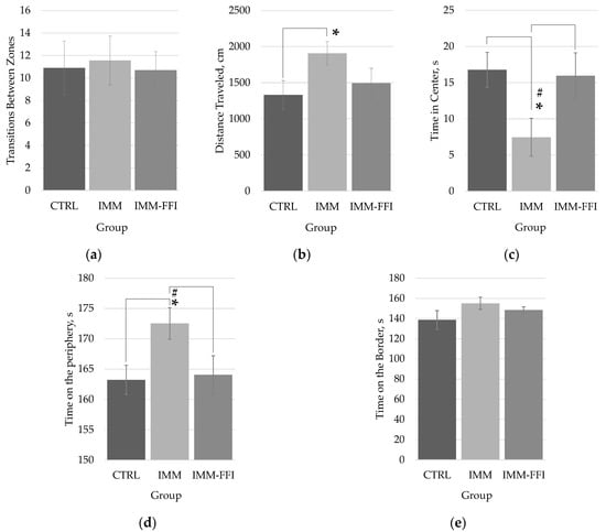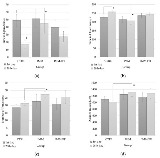| Time in open arms, s | 49 ± 7 | 51 ± 10 | 40 ± 9 |