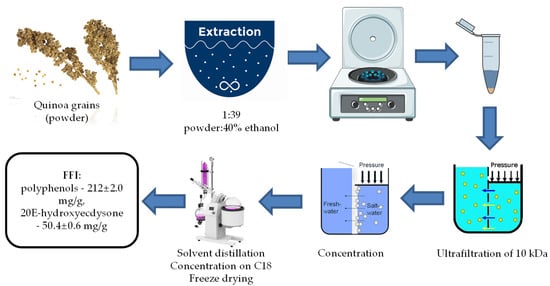 - Zorin, S.N.; Sidorova, Y.S.; Petrov, N.A.; Perova, I.B.; Malinkin, A.D.; Bokov, D.O.; Bessonov, V.V.; Mazo, V.K. A New Functional Food Ingredient Enriched by Phytoecdisteroids and Polyphenols from Quinoa Grains (Chenopodium quinoa Willd.). Res. J. Pharm. Technol. 2021, 14, 4321–4328. [Google Scholar] [CrossRef]