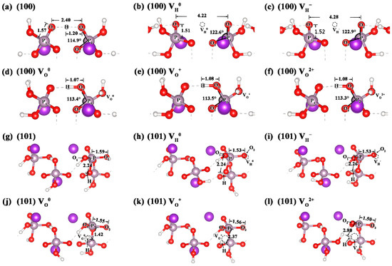 In order to further understand the impact of surface vacancy defects on the surface structures, we compared the local lattice distortion caused by the neutral and charged VH and VO defects on the (100) and (101) surfaces of KDP crystals in Figure 2. The change in the related bond lengths and bond angles are listed in Table 2. For the (100) surface, the removal of a surface hydrogen atom leads to two oxygen atoms that were initially connected through this hydrogen atom (O-H…O hydrogen bond) moving away from each other, and, thus, the distance between O1 and O2 increases by 1.82 Å (Figure 2b). At the same time, the two PO4 tetrahedra connected by this hydrogen atom distort with the bond angle ∠O2P2O3 increasing by about 8°. The influence of an electron captured by the neutral VH defect on the structure can be neglected (Figure 2c). For the VO defect, the adjacent hydrogen atom falls into the original vacancy defect, which leads to the movement of the hydrogen atom into the adjacent hydrogen bonds toward the PO4 tetrahedron. The bond length of H-O2 is, thus, shortened by 0.12 Å (Figure 2d). The effect of a one and two electron loss from the neutral VO defect on the structure can also be neglected (Figure 2e,f).