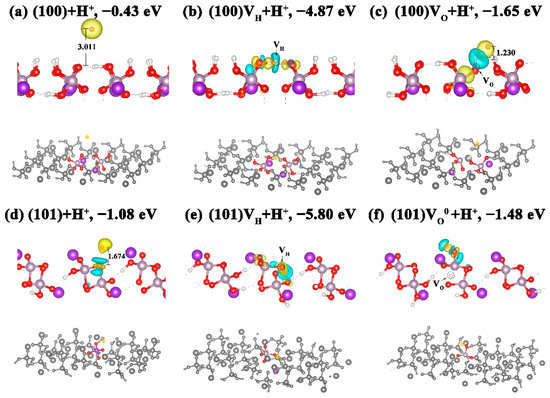 Local and overall structures as well as the charge-density difference maps of H+ adsorbed on (100) and (101) surfaces. (a) Perfect (100) surface; (b) (100) surface with a VH defect; (c) (100) surface with a VO defect; (d) perfect (101) surface; (e) (101) surface with a VH defect; (f) (101) surface with a VO defect. Yellow and blue regions represent electron accumulation and depletion, respectively. The corresponding adsorption energy is listed at the top of each figure.