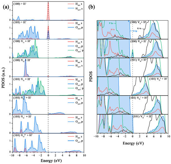 (a) Partial density of states of the adsorbed H+ ions and the adjacent surface atoms on the (100) and (101) surfaces; (b) partial density of states of the H+ adsorbed (100) and (101) surfaces with VH and VO defects.