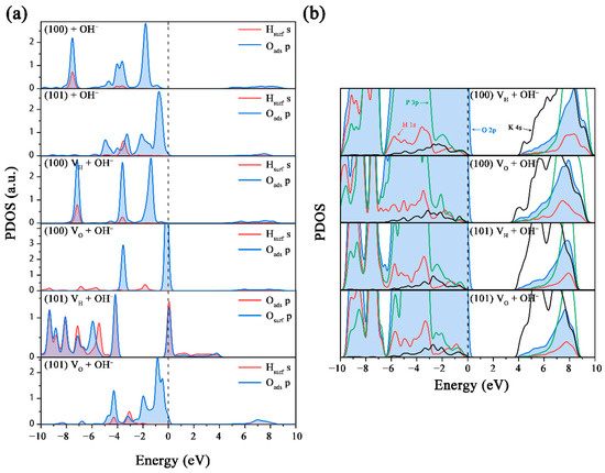 (a) Partial density of states of the adsorbed OH− ions and the adjacent surface atoms on the (100) and (101) surfaces; (b) partial density of states of the OH− adsorbed (100) and (101) surfaces with VH and VO defects.