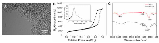 (A) TEM micrograph of MCF; (B) N2 adsorption–desorption isotherms and BJH (inset) and (C) FT-IR spectra of MCF and MCF-IL.