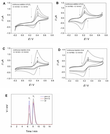 As shown in Figure 4A,B, with the addition of H2O2, the continuous internal contraction in redox currents for Fe(CN)63−/4− was observed whether in HCl solution (Figure 4A) or in PBS (Figure 4B). In addition to H2O2, it was found that air could also lead to a similar contraction in Fe(CN)63−/4− redox curves (Figure 4C,D).