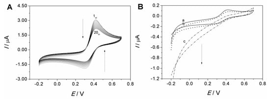 (A) Twenty consecutive CVs obtained on MCF-IL-Fe(CN)63−/PVA electrode in 0.1 M HCl + 0.1 M KCl solution, scan rate: 100 mV s−1; (B) CVs obtained on acid-pretreated MCF-IL-Fe(CN)63−/PVA electrode upon the continuous addition of H2O2: (a–c); scan rate: 10 mV s−1.