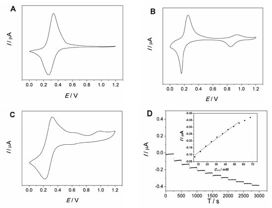Figure 6A shows the CV on a freshly prepared MCF-IL-Fe(CN)63−/PVA electrode, where a pair of well-defined reductive–oxidative peaks at about 0.33 V were observed, indicating the typical redox behavior of Fe(CN)63−/4−. Figure 6B shows the CV on a PB electrode, which presented two couples of redox peaks with formal potential around 0.20 V and 0.95 V, corresponding to the typical cyclic voltammograms of PB [36]. The couple of redox peaks with formal potential around 0.20 V indicated the transformation between Prussian blue and Prussian white (PB/PW), while the couple of redox peaks around 0.95 V presents the transformation between Prussian blue and Berlin green (PB/PG). Figure 6C displays the CV on the acid-pretreated MCF-IL-Fe(CN)63−/PVA electrode. A pair of redox peaks with a formal potential value of 0.27 V and an anodic peak at 0.95 V was observed.