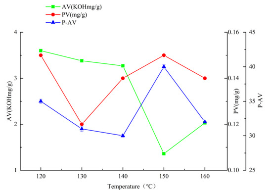 It could be seen that the overall content of aldehydes at 120 °C was higher than other temperatures in the reaction temperature, especially 1-hexanal (green, grassy), 1-nonanal (fatty), 1-octanal (fatty), (E)-2-nonenal (cucumber), (E)-2-decenal (fatty) and 2-undecenal (orange peel). The 1-heptanal (fatty), benzaldehyde (nutty), and 2-methylpyrazine (nutty) at 150 °C were more prominent. However, according to the sensory evaluation and determination of the oxidation index, it was found that although the overall substance content was high at 120 °C, the flavor was not very popular, largely because the temperature did not reach the melting point during the melting process, resulting in a slight fishy and greasy taste of the overall flavor and, thus, the aldehyde content was higher than that of samples at other temperatures.