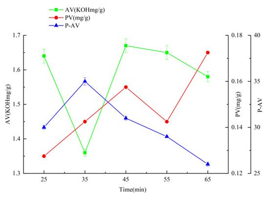 When the temperature is 150 °C, the time is 35 min, and the airflow rate is 108 L/h (Figure 1, Figure 2 and Figure 3), the hydroperoxide, the primary oxidation product of tallow, reaches the maximum value. When it exceeds this value, the tallow oxidation is already in the termination stage. It can be seen in the figure that the PV and P-AV values change significantly beyond a specific node, so it is speculated that the oxidation induction period should be less than 35 min and the reaction is already in the oxidation transfer period; that is, the generation of hydroperoxide in the primary oxidation reaction and the pyrolysis of hydroperoxide in the secondary oxidation reaction are both increasing significantly, but the primary oxidation reaction is the main reaction, so both PV and p-AV values increase. At 150 °C, the primary oxidation product of tallow hydroperoxide reached the maximum value. When the temperature exceeds 150 °C, the oxidation of tallow was in the end stage and the generation of secondary oxidation products, namely the pyrolysis reaction of hydroperoxide, became the leading reaction and the generation of primary oxidation products took a back seat, so the PV value began to decline while the P-AV value increased significantly. From the aspect of the reaction mechanism, the higher the melting temperature and oxygen supply, the lower the AV value. It reached the lowest point at 150 °C and 108 L/h, which may be due to the oxidation of unsaturated fatty acid to generate hydroperoxide. Considering the influence of oxidation temperature on the PV, P-AV, and AV value, the oxidation melting of tallow at 150 °C for 35 min and an airflow rate of 108 L/h was selected.