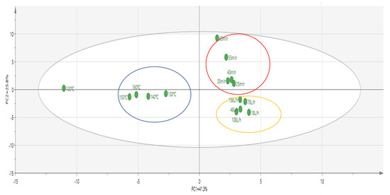 In order to further clarify the aroma characteristics of oxidized melted tallow under different conditions, principal component analysis was performed on 15 levels of oxidized melted tallow with different factors according to the compositions and contents of different aroma compounds, as shown in Figure 5. It could be seen from the figure that the samples of 15 levels of oxidation-smelting tallow with different factors were relatively concentrated and could be divided into three types after dimension reduction treatment with a principal component.