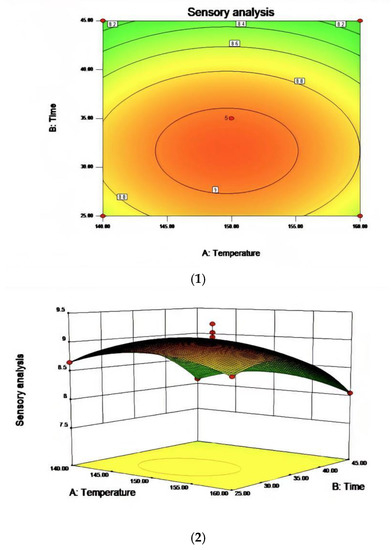 The effect of the interaction between reaction temperature and reaction time on sensory evaluation (1) and a contour map of the reaction temperature and reaction time (2).
