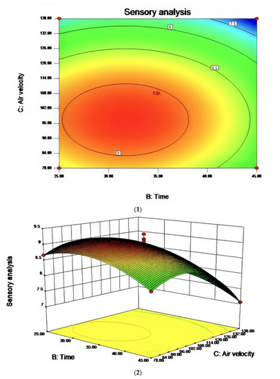 The effect of the interaction between reaction temperature and air velocity on sensory evaluation (1) and the contour map of reaction temperature and air velocity (2).
