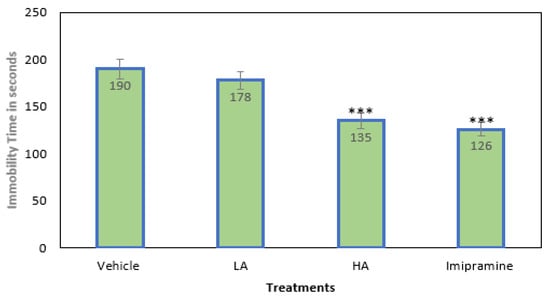 The effect of apigenin and imipramine on immobility period. Data are expressed in mean ± SEM (n = 8). Data were evaluated using a one-way analysis of variance (ANOVA) and Tukey’s test. *** p < 0.001 when compared to the vehicle control group. LA: low dose of Apigenin (25 mg/kg); HA: high dose of Apigenin (50 mg/kg); Imipramine: standard antidepressant (15 mg/kg); Vehicle; 0.2% carboxy methyl cellulose (CMC).