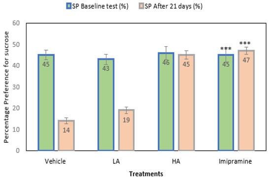 The effect of apigenin and imipramine on percentage sucrose preference. Data are expressed in mean ± SEM (n = 8). Data were evaluated using a one-way analysis of variance (ANOVA) and Tukey’s test. *** p < 0.001 when compared to the vehicle control group. LA: low dose of Apigenin (25 mg/kg); HA: high dose of Apigenin (50 mg/kg); Imipramine: standard antidepressant (15 mg/kg); Vehicle; 0.2% carboxy methyl cellulose (CMC).