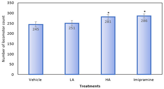 The effect of apigenin and imipramine on the number of locomotor counts. Data are expressed in mean ± SEM (n = 8). Data were evaluated using a one-way analysis of variance (ANOVA) and Tukey’s test. * p < 0.05 when compared to the vehicle control group. LA: low dose of Apigenin (25 mg/kg); HA: high dose of Apigenin (50 mg/kg); Imipramine: standard antidepressant (15 mg/kg); Vehicle; 0.2% carboxy methyl cellulose (CMC).