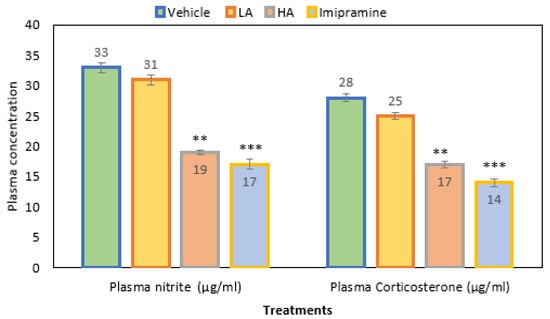 The effect of apigenin and imipramine changes on plasma nitrite and corticosterone levels. Data are expressed in mean ± SEM (n = 8). Data were evaluated using a one-way analysis of variance (ANOVA) and Tukey’s test. ** p < 0.01; *** p < 0.001 when compared to the vehicle control group. LA: low dose of Apigenin (25 mg/kg); HA: high dose of Apigenin (50 mg/kg); Imipramine: standard antidepressant (15 mg/kg); Vehicle; 0.2% carboxy methyl cellulose (CMC).