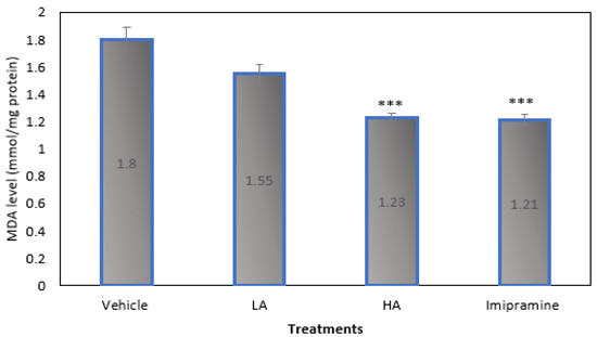 The effect of apigenin and imipramine on brain malondialdehyde (MDA) levels. Data are expressed in mean ± SEM (n = 8). Data were evaluated using a one-way analysis of variance (ANOVA) and Tukey’s test. *** p < 0.001 when compared to the vehicle control group. LA: low dose of Apigenin (25 mg/kg); HA: high dose of Apigenin (50 mg/kg); Imipramine: standard antidepressant (15 mg/kg); Vehicle; 0.2% carboxy methyl cellulose (CMC).