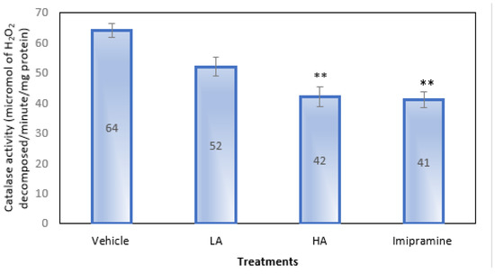 The effect of apigenin and imipramine on brain catalase activity. Data are expressed in mean ± SEM (n = 8). Data were evaluated using a one-way analysis of variance (ANOVA) and Tukey’s test. ** p < 0.01 when compared to the vehicle control group. LA: low dose of Apigenin (25 mg/kg); HA: high dose of Apigenin (50 mg/kg); Imipramine: standard antidepressant (15 mg/kg); Vehicle; 0.2% carboxy methyl cellulose (CMC).