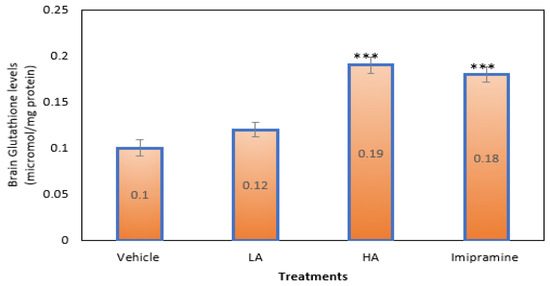 The effect of apigenin and imipramine on brain-reduced glutathione levels. Data are expressed in mean ± SEM (n = 8). Data were evaluated using a one-way analysis of variance (ANOVA) and Tukey’s test. *** p < 0.001 when compared to the vehicle control group. LA: low dose of Apigenin (25 mg/kg); HA: high dose of Apigenin (50 mg/kg); Imipramine: standard antidepressant (15 mg/kg); Vehicle; 0.2% carboxy methyl cellulose (CMC).