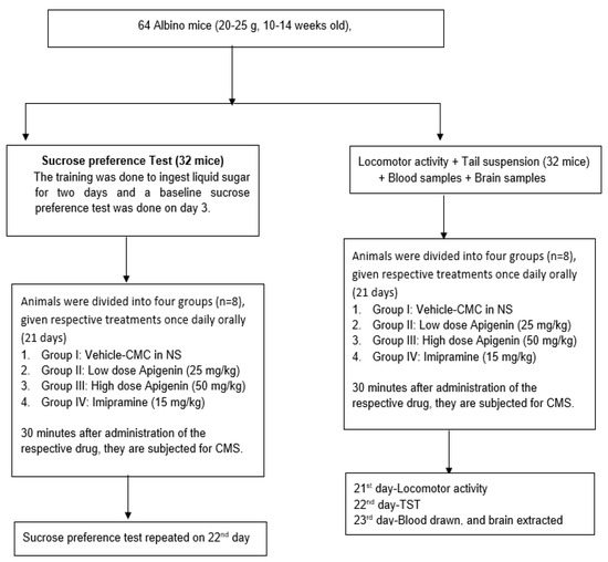Eight groups, each including eight mice, were formed from all the mice used in the study (Figure 8). All treatments were done orally and once daily. As a vehicle, 0.2% carboxymethyl cellulose (CMC) in 0.9% sodium chloride was administered to the group I, while dosages of apigenin of 25 mg/kg (low dosage of apigenin—LA) and 50 mg/kg (high dose of apigenin—HA) were administered to groups II and III, respectively. Animals in group IV were given imipramine (15 mg/kg). For three weeks, all treatments (chronic mild stress—CMS) were ingested orally 30 min before the onset of stress (21 days). The mice’s locomotor activity was measured on day 21 following 60 min of stress exposure. The mice underwent a TST on the 22nd day. Vehicle therapy (CMC) was given to the animals in group V, whereas an LA and HA were provided to the animals in groups VI and VII, respectively. Group VIII animals received imipramine (15 mg/kg). All treatments were given orally for three weeks before subjecting the animals to their respective stress pattern of CMS. A sucrose preference test was conducted on day 21 at 60 min following CMS [36].