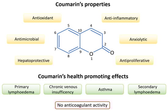 In addition to lymphoedema, the health-promoting actions of coumarin have been demonstrated in other diseases including chronic venous insufficiency, asthma, and breast cancer [,]. These results, together with coumarin’s bioavailability and low cost, make this compound very attractive as a therapeutic agent; its great versatility could be exploited in diverse fields including pharmacology, but also medicinal chemistry [], and food science [].