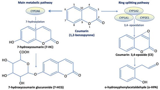 As previously discussed, several isoforms of the cytochrome p450 enzymes (CYPs) are involved in coumarin metabolism. In humans, coumarin is predominantly eliminated via 7-hydroxylation by p450 CYP2A6. Conversely, the coumarin-induced liver toxicity is related to the coumarin metabolite o-HPA deriving from CE via the alternative heterocyclic ring-splitting pathway. This seems to be the predominant pathway in patients that develop hepatotoxicity.