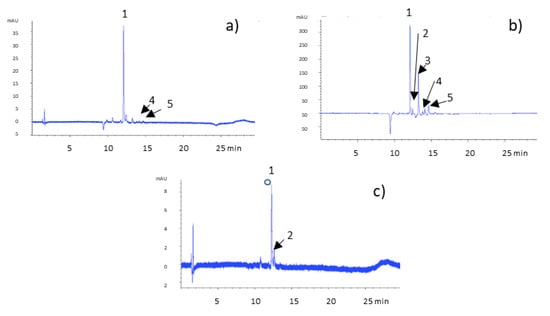 Chromatogram of A. cepa Golden variety extracts recorded at 370 nm. (a) Tunicate bulb extract, (b) tunic extract, and (c) bulb extract. Peaks shown are: (1) quercetin 3,4’-diglucoside, (2) quercetin 3-monoglucoside, (3) quercetin 4′-monoglucoside, (4) quercetin 4′-methyl-3′- glucoside, and (5) quercetin aglycone.