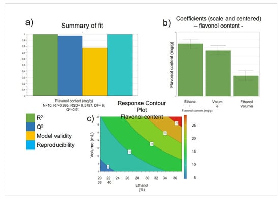 Optimization of tunic A. cepa extraction method using DoE. Summary of fit plots (a), regression coefficients of the developed model (b), and surface response plot (c).