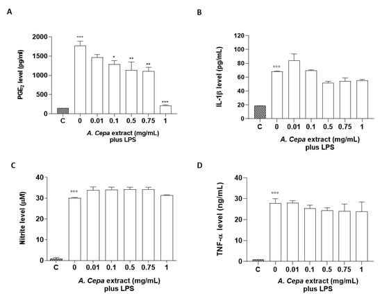 To assess the anti-inflammatory properties of A. cepa extract, a murine macrophage cell line J774, stimulated with LPS (10 µg/mL, 24 h) as a well-known proinflammatory stimulus, was used. Anti-inflammatory activities were assessed by measuring the levels of proinflammatory mediators such as PGE2, IL-1β, nitrites, and TNF-α. Pre-incubation of J774 macrophages with A. cepa extract (2 h before LPS) inhibited the production of PGE2 induced by LPS significantly and in a concentration-dependent manner (0.1, 0.5, 0.75, and 1 mg/mL) (Figure 4A), while it reduced IL-1β release, but not in a significant manner (Figure 4B). Conversely, treatment with A. cepa extract did not display an inhibitory effect on the production of nitrites and TNF-α induced by LPS. In order to rule out any alteration in cell viability, an MTT assay was performed and did not show any statistical reduction of cell viability after treatment with the extract (data not shown).