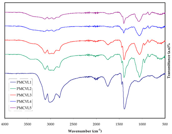FTIR spectra at a wavenumber between 500 cm−1 and 4000 cm−1 for PMCVL1, PMCVL2, PMCVL3, PMCVL4, and PMCVL5 electrolyte films.
