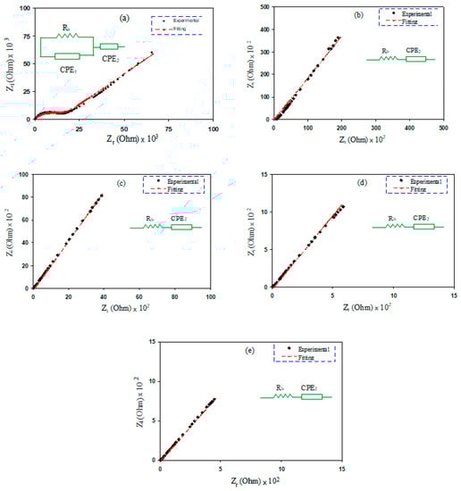 EIS plots for (a) PMCVL1, (b) PMCVL2, (c) PMCVL3, (d) PMCVL4, and (e) PMCVL5.