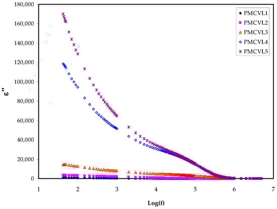 Basically, the appearance of a peak in the imaginary portion M″ indicates the region where the charges move at a long displacement (to the left of the peak) or the carriers are confined (to the right of the peak) [58]. As confirmed in earlier studies, the ɛ″ parameter is influenced by an ohmic conduction (DC conductivity) [59,60]. Thus, the loss peaks disappear largely in ɛ″ spectra, as exhibited in Figure 4.