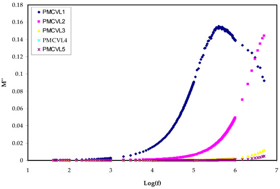 Several other measured or derived quantities can be obtained from impedance spectroscopy (IS). The measurement, analysis, and plotting of some, or all, of the four impedance-related functions (Z*, Y*, M*, and ε*) in the complex plane can be gained from impedance spectroscopy [51]. To have knowledge about the conductive effects and the expression of the complex electric modulus (M* = 1/ε*) is helpful [52]. One of hot topics in the field of condensed matter physics is the study of conductivity relaxation behaviors in conducting polymer materials. This is a result of the many applications in electrochemical devices [53,54]. Examining he relaxation performance of ion-conducting polymers can accurately be performed by means of an electric modulus (M*) formalism. This provides an opportunity to deal with the relaxation and conductivity in a polymer via the electric modulus spectrum [55,56]. The region where the electrical relaxation phenomena occur in PEs is the interface, in addition to the polarization and the phase transition or conductivity mechanism [57]. Equations (16) and (17) are used to determine the M′ and M″, respectively. The step-like transitions from a low value to a high value in M′ spectra are followed (Figure 5) in all the samples. These transitions show the existence of a relaxation mechanism, accompanied by a loss peak in Figure 6 [57]. The peak in M″ spectra (Figure 6), which is distinct, can be correlated with conductivity relaxation. Furthermore, an increase in salt concentration results in the shifting of the peaks to the higher-frequency range.