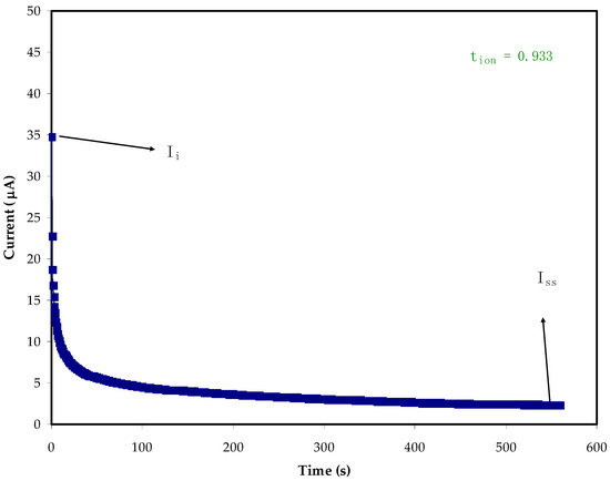 To decide on the main charge carrier within the electrolytes, it is essential to find TNM. The DC polarization technique is one of the ways for determining the ion transference number (tion) of PE samples. Accordingly, DC voltages are swept, and the currents are recorded correspondingly within an experimental time scale in an electrochemical cell sample at a certain potential window [64]. As stated by Shukur et al. [65], the transference number of the ion (tion) is a suitable indicator of when it is in unity, as ions are regarded as the dominant charge carrier within the PE systems. Figure 7 and Figure 8 reveal the steady state, during polarization, for the PVA:MC:NH4Cl. The current decreases at the beginning and as the time proceeds, there is a current decay where the ionic species depletion within the electrolytes, and the diffusion process are responsible for mobile ion movement [66,67]. The initial high-value current is because the ions and electrons are participating in the beginning. The polarization of the cell occurs when it reaches the steady state, while the moving of the rest of the current is only due to electrons. This is due to the fact that the stainless-steel electrodes make a barrier for the ions, while only allowing the electrons to move through [41]. This is why the electron transference number (tele) is measured by the stainless-steel electrodes [68]. Equations (7) and (8) are used to determine tion and tele, respectively [69,70]. In this work, the average value of tion for the electrolyte (PMCVL5) is 0.933, while the telec for (PMCVL4) is 0.088, supporting the idea that ions are the dominant charge carriers in the PVA:MC:NH4Cl electrolyte. This behavior can be exploited for utilization in electrochemical energy devices. The glycerolized chitosan–NH4Br system has also previously been reported to have comparable results [71].