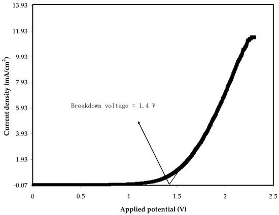 The linear sweep voltammetry (LSV) tells us the maximum operating voltage of an electrolyte, where there is a range that allows for the implemented voltages to work [72]. Figure 9 shows the LSV response of the electrolyte at 10 mV/s at room temperature. In the LSV, the applied voltage varied from 0 to 2.5 V. From 0 to below 1.4 V, the current did not pass through the electrolyte, meaning that the sample can withstand below 1.4 V. While electrolysis occurs beside the 1.4 V and the current passes through the PE due to the occurrence of oxidation. As mentioned above, below 1.4 V, no current flows within the electrolyte, indicating the absence of any electrochemical reaction [73]. The decomposition of the PVA:MC:NH4Cl, as the electrolyte of use, at the voltage of 1.4 V, occurs. Consequently, this voltage range makes this electrolyte eligible for its utilization in EDLC, which exceeds the normally operating voltage of 1.0 V [74]. Here, the voltage window range of the PE is 1.4 V, which is reasonable.