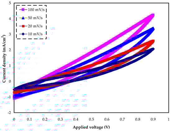 From the cyclic voltammogram, one can recognize the charge storage behavior at the electrodes–electrolyte interface of an EDLC assembly. The CV was performed for the electrolyte at different scan rates, as revealed in Figure 10. It is seen that the CV response distorts clearly from th rectangular shape to the sharp leaf shape. This phenomenon originated from two parameters: namely, the carbon electrode’s porosity, and the internal resistance [75]. Especially at higher scan rates, the CV curves are very close to a leaf shape, as at higher scan rates the ions move very fast, and no proper double-layers are formed at the electrode–electrolyte interfaces. From Figure 10, it is obvious that there are no significant differences in the double-layer charging current with varying scan rates. To our knowledge, the lattice energy (LE) of salts is affect greatly by the electrochemical behavior of the devices. Salts with a high LE allow little ions to dissociate and contribute to the formation of a double layer of charges. The LE of NH4Cl, at 708 KJ/mol, is higher than that of 682 KJ/mol for NH4Br, or 637 KJ/mol for NH4I salt [76]. Moreover, there are no peaks in the allowed voltage range of the CV, indicating that neither oxidation nor reduction in the EDLC occurs. Principally, the charging mechanism causes anions and cations to move oppositely toward the anode and cathode electrodes, respectively, in the EDLC assembly. The negatively charged electrode (cathode) will attract positive ions (cations) from the PE solution, while the positively charged electrode (anode) will attract negative ions (anions) from the electrolyte solution. The stainless-steel electrodes block ions at the surface of the electrodes to form a double-layer capacitor at the surface of the electrodes. The induced electrical field leads to an interaction between the anode (positive) electrode and the anions; in contrast, the opposite situation takes place at the negative (cathode) electrode. The relatively high electric field results in the electrons and ions to be held by electrode and electrolyte, respectively [77]. This is the double-layer charge formation, which is developed on the surface of carbon electrodes where the stored energy is in the form of potential energy [78]. The values of Cs are calculated by using Equation (9) [79] at various scan rates, as tabulated in Table 3. However, by adding a plasticizer, for example, glycerol, to the PE system, the values of Cs can be improved, as glycerol can dissociate more salts into free ions and, thus, more ions are adsorbed at the surface of the electrodes [41]: