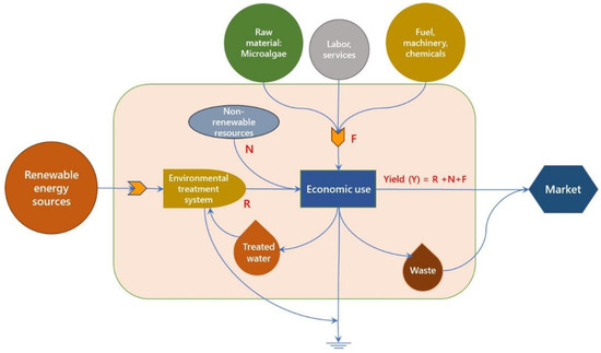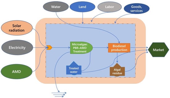 Following the principles of Odum [30], the sustainability of the acid-adapted microalgal technology proposed for acid mine drainage treatment was evaluated via emergy analysis. Emergy is defined as “the quantity of energy (particularly solar emergy) used to develop a resource, both directly and indirectly” [30]. Emergy measures the worth of resources, products, and services in a single unit of energy called solar emergy, which is measured in solar emjoules (sej). All system inputs such as energy, materials, and services are transformed to energy units using a conversion factor termed “transformity” throughout the analysis. The efficiency index is defined as the amount of solar energy necessary to deliver a joule of a product or service (sej/J). For example, the relationship between emergy of a biomass () and its energy content () is given by transformity () as shown in the equation: