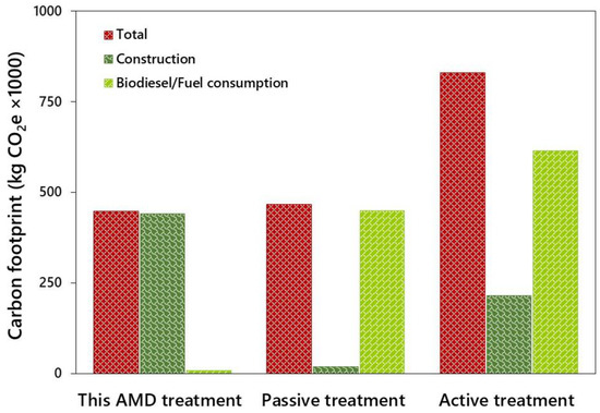 To calculate the carbon footprint, carbon dioxide equivalents (CO2e) were used [27]. CO2, methane (CH4), and nitrous oxide (N2O) were transformed to CO2e based on their respective global warming potential, usually calculated on a mass basis [41]. CH4 and N2O have global warming potentials of 25 g CH4/g CO2e and 298 g N2O/g CO2e, respectively [41]. All the materials and fuels used during construction were multiplied by their corresponding emission factors to calculate the carbon footprint of a system. The emergy analysis of the passive treatment system (PTS) and active treatment system (ATS) used emission factors established in the literature to multiply the construction material inputs and fuel use [42,43,44]. In addition, direct Scope 1 and indirect Scope 2 emissions were calculated based on Australian National Energy Reporting System [45]. For this, the electricity data and diesel consumption were used in appropriate index to generate CO2 equivalent values.